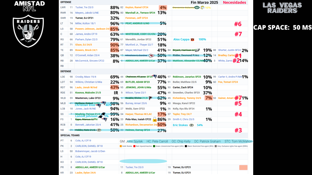 En el siguiente gráfico se actualizará la temporada con los cambios y analizaremos el mercado de Agencia Libre y Draft. El Nuevo General Manager es John Spytek ( Ya analizaremos su figura en otro artículo) intentará traer lo que Carroll necesite.